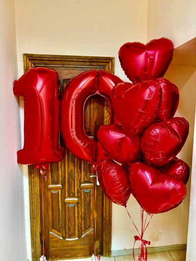 Червоний колір – це символ енергії, радості та безмежної любові. Композиція червоних фольгованих сердець та великіх цифр – це стильно, фотогенічно, яскраво і захоплююче.
